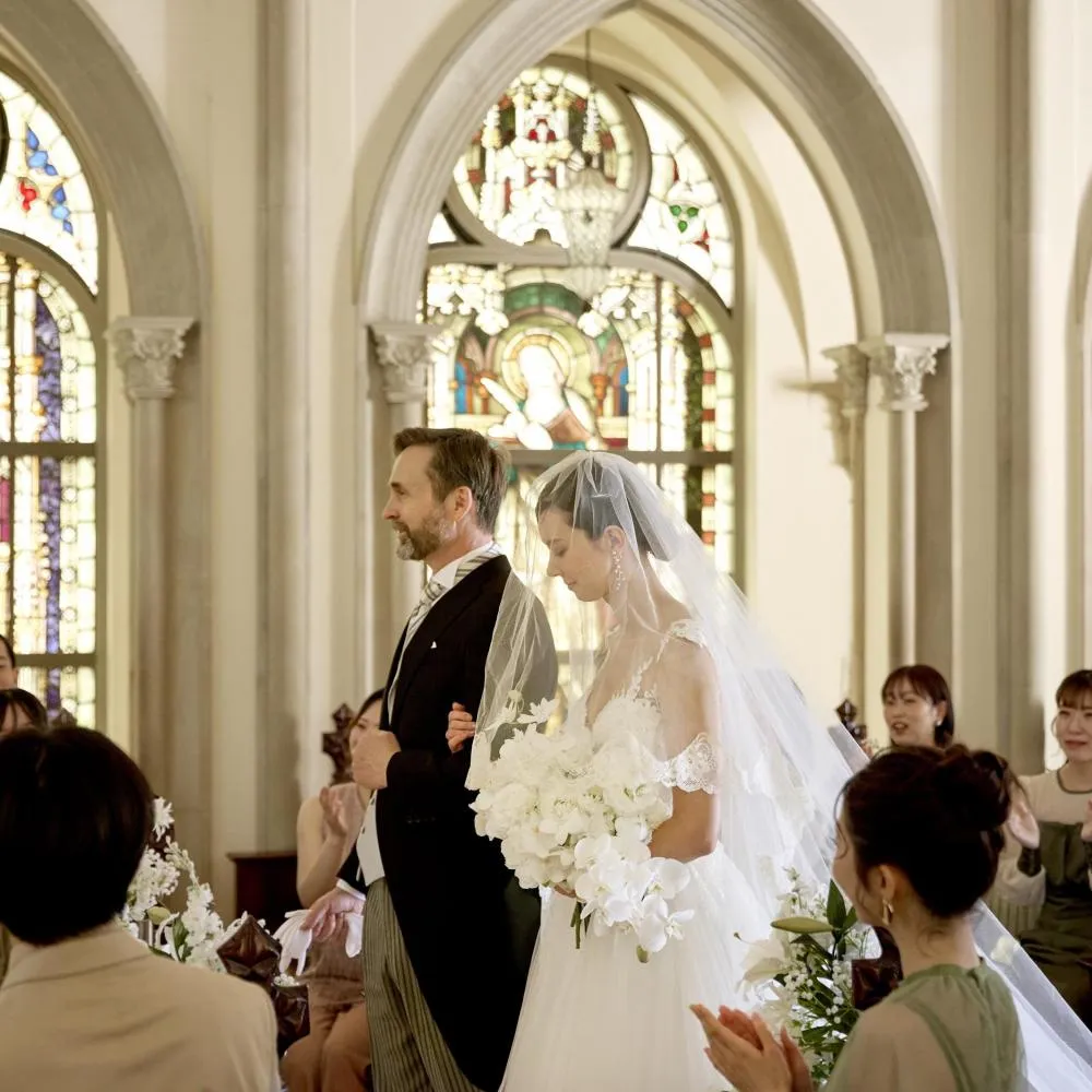\初見学におすすめ!感動挙式&人気の牛フィレ試食付き/ステンドグラスの大聖堂と雰囲気の異なる5つの貸切会場で当日さながらの花嫁体験!AMフェア参加で大聖堂での生演奏や演出体験など卒花人気の体験型フェア